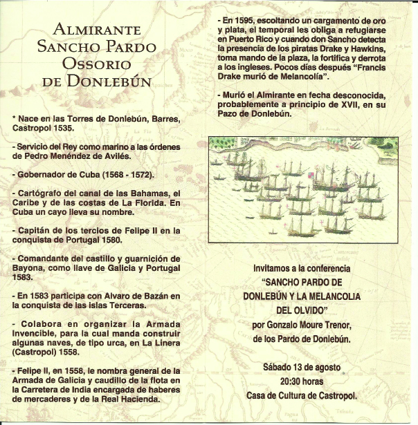 El almirante Sancho Pardo de Donlebún nació en 1535 en la localidad castropolense de Barres, donde falleció a principios del siglo XVII. Este castropolense, apenas recordado, llegó a ser gobernador de Cuba, cartógrafo del Caribe y general de la Armada de Galicia en 1558, entre otros logros. Son algunas de las razones por las que la Fundación Ría del Eo quiere contribuir a la recuperación y divulgación de su historia.